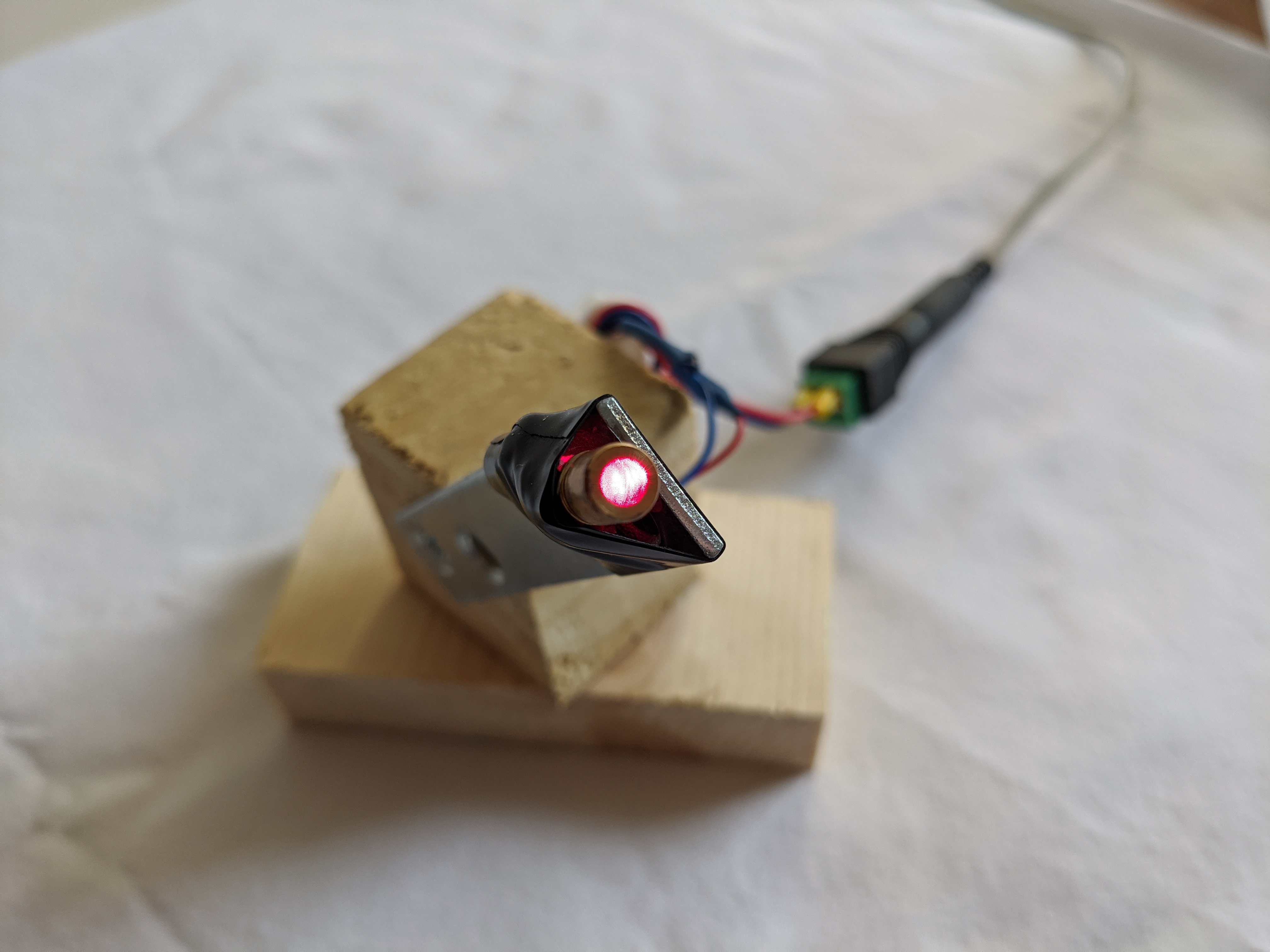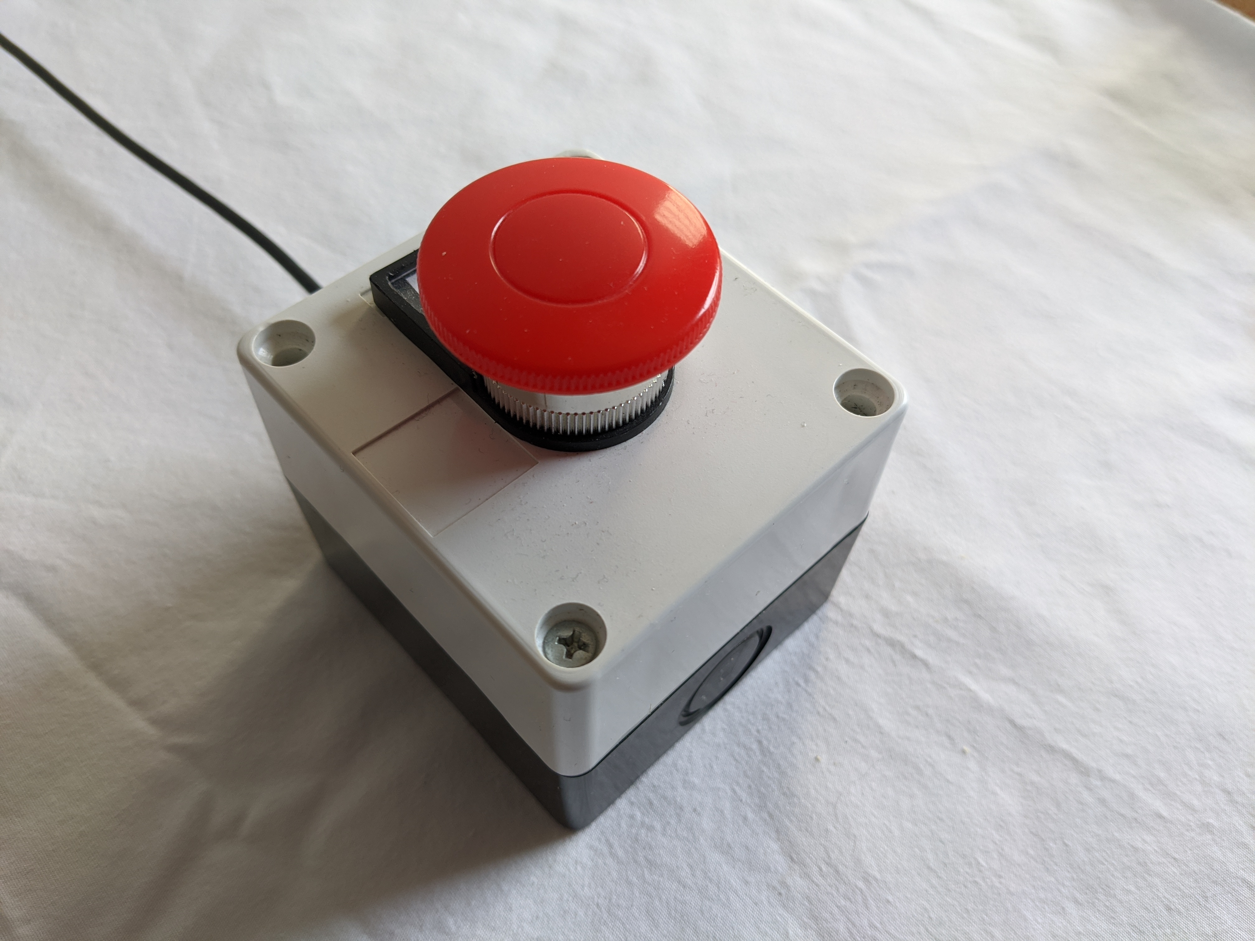 Placing a large emergency stop button at the end of the maze allows participants to "win" the maze and deactivate the lasers. The button is wired through a barrel jack connector to a Raspberry Pi pin.