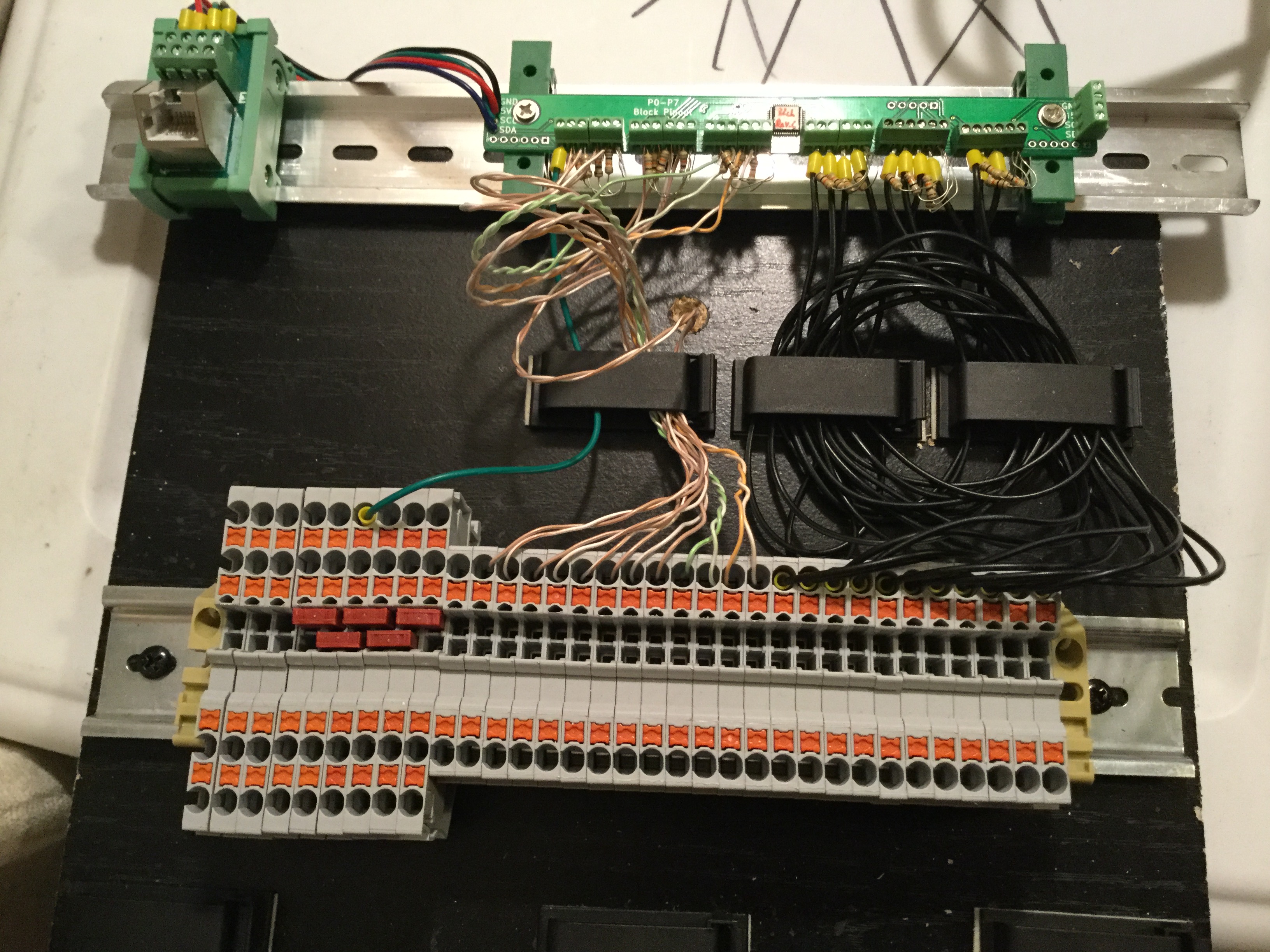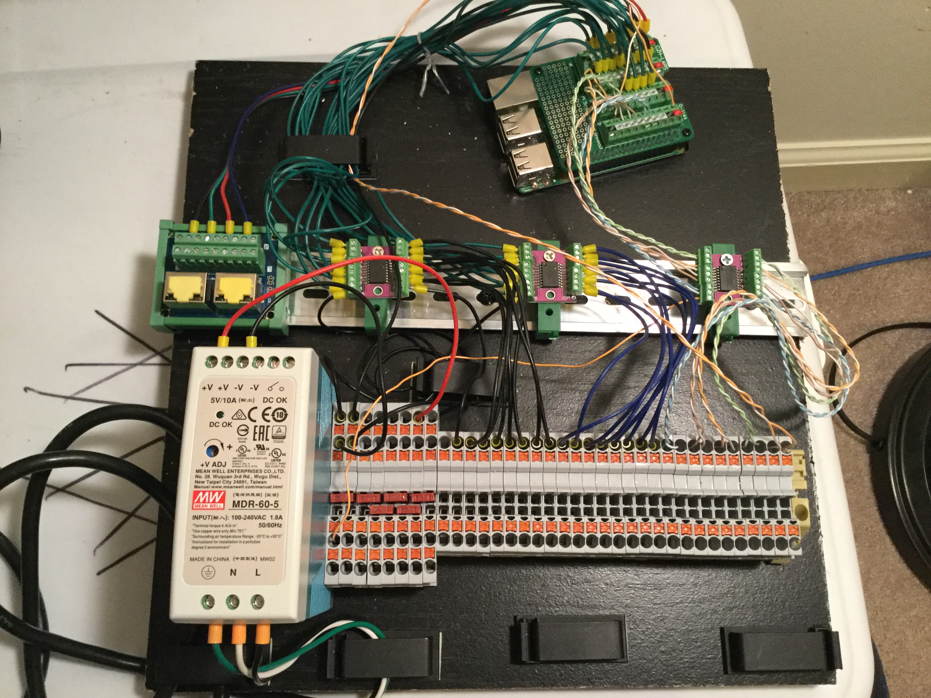 Since 24 laser modules draw more current than a Raspberry Pi can handle and since they run at 5V instead of 3.3V, transistor arrays are used to offload this power from the Pi to the power supply. Each pin on the Pi triggers an individual transistor on the array with minimal current draw. Components are mounted to a DIN rail for rugged and reliable performance.